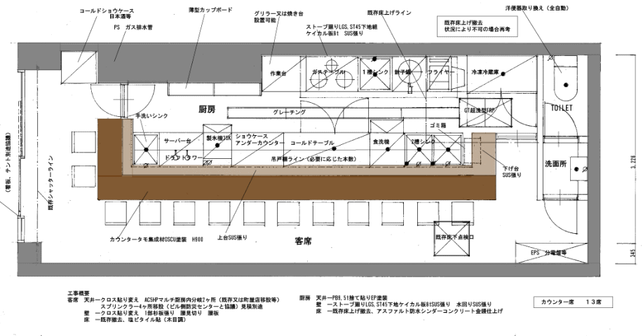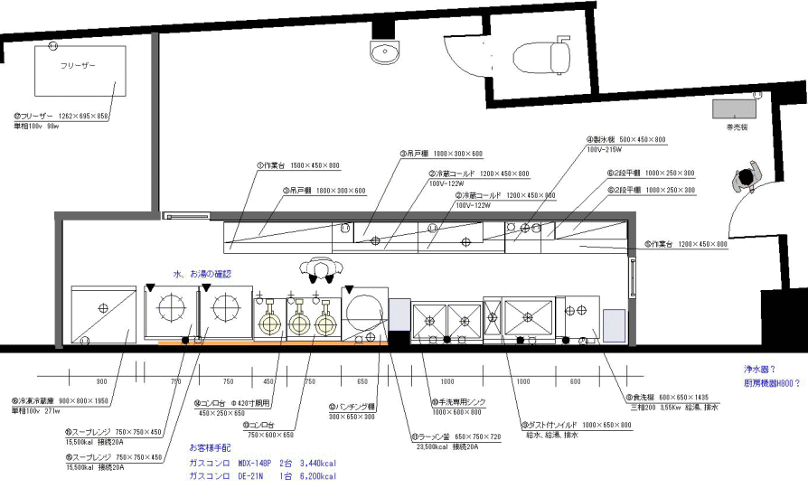 下記は餃子中心の厨房レイアウト図面です。カウンターだけで2~3名で営業するスタイルです。少人数での営業はカウンター席13名ぐらいが妥当な席数です。