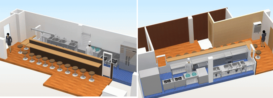上記図面を3Dで表現しました。カウンターの高さはH900が一般的です。2段カウンターなら低く抑えることができます。落ち着いて食べれる店づくりには適しています。