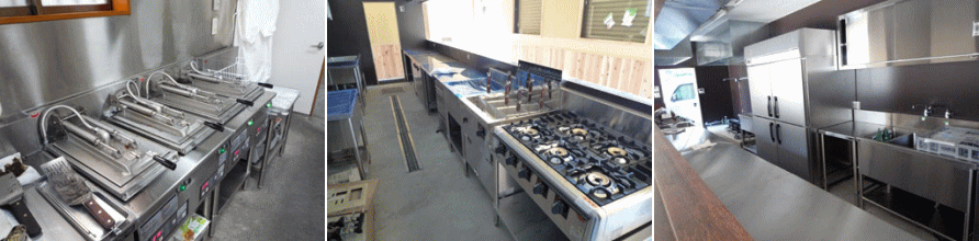 ラーメン店の厨房設計施工の一例です。 餃子焼機、一口コンロ、食器洗浄機など、各ラーメン店に合わせて施工します。