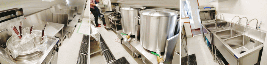 下記は都内のラーメン店の施工事例です。券売機に食器洗浄機、ソイルドテーブルは二槽式、蛇口付きのスープ寸胴が特徴です。ゆで麺機は一般的なラーメン釜を使用しています。