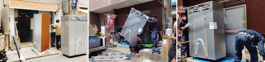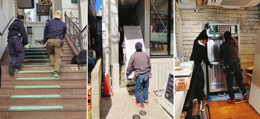 難しい納品、カウンター超し、階段上げ、冷凍機・扉を外して搬入など、プロにお任せ下さい。