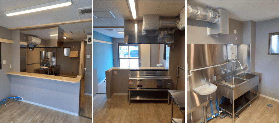 下記はお好み焼店の施工例です。ドライキッチン、家庭用湯沸かし器、ダクト工事…低資金で施工できました。