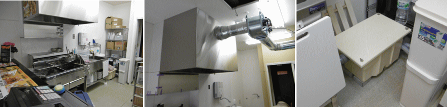 1Fの事務所仕様のテナントをから揚げ店に。ガス式2槽フライヤー、フードは必需、1Fなので標準的な工事でした。グリーストラップは置き型、予算も抑えることができました。