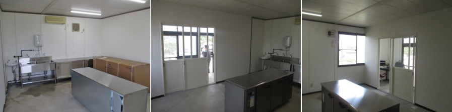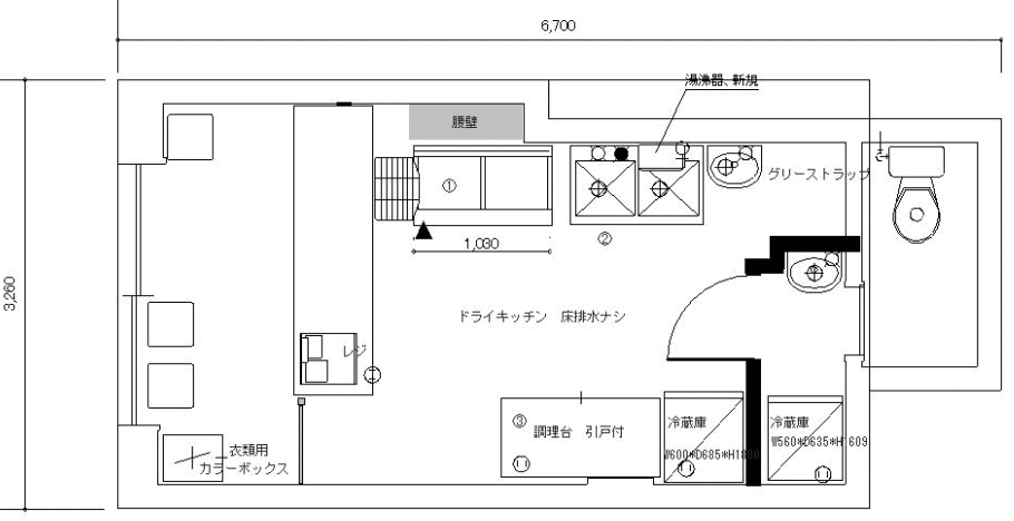 高齢者宅配弁当店の施工事例、入口から厨房に入るまで風除室のように1室必要になります。トイレにもじかに厨房から入るわけにはいきません。壁を2つ造って中央が厨房、調理はしないので最低限の設備と工事・・・・ドライキッチン。