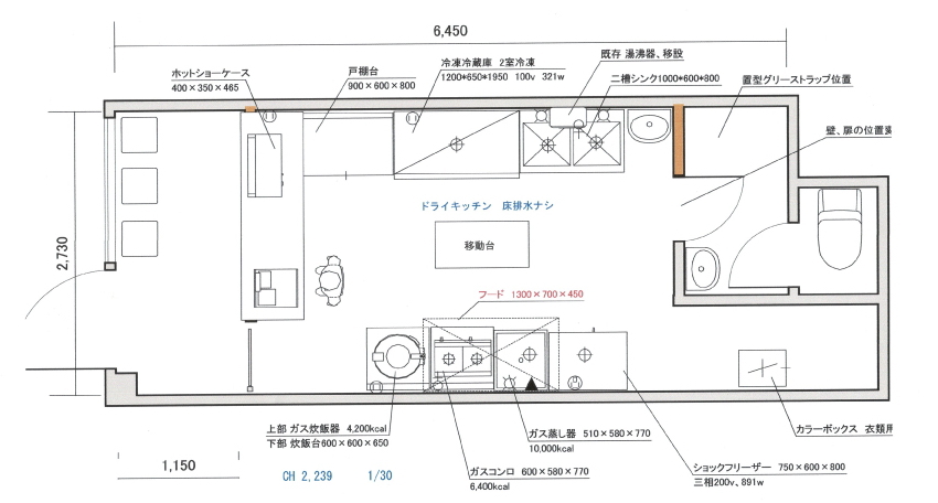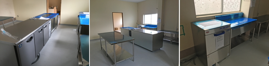 下記はイートイン席もありますが、お弁当の販売を考えた厨房です。調理はガスレンジ、コンベクションオーブン付、食器洗浄機を設置、中央が盛り付け台になります。