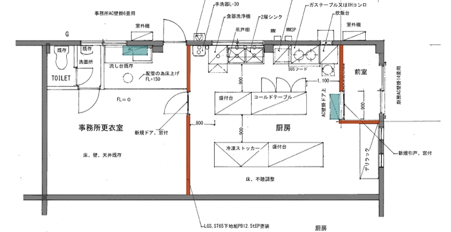 給排水、電気、ガス工事、フードダクトの換気工事も考慮して図面を作成いたします。