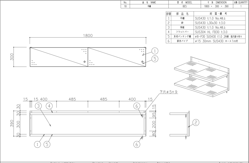 ステンレス水切棚2段、パンチング板、取外し、排水ホース付特注 1800×300×300 販売価格 95,000円
