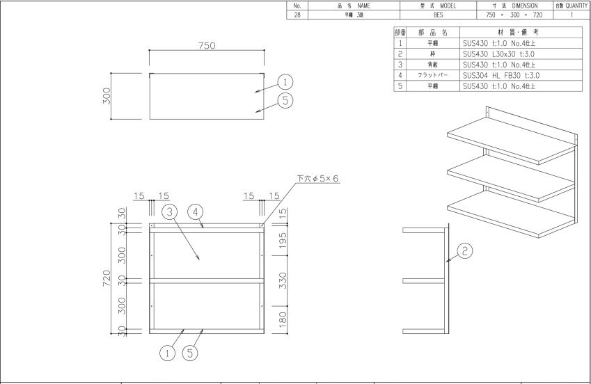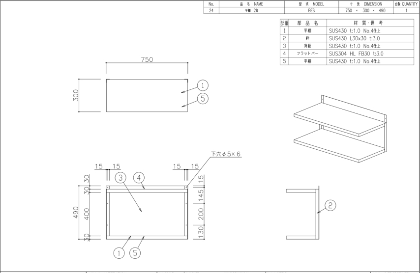 特注ステンレス2段棚の製作図面 実際に納品しています。