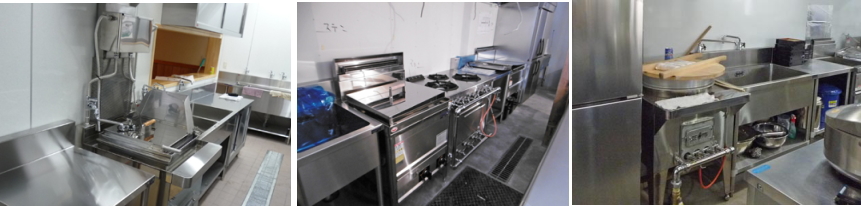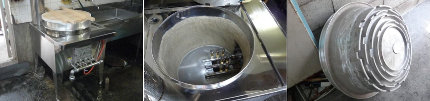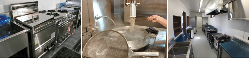 左はうどん釜、中央は押出し製麺機付きそば釜でブラストで火力を強くしています。
